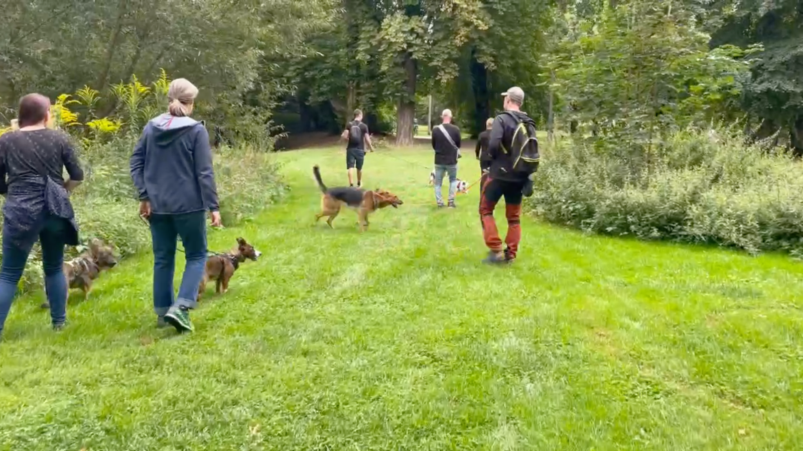 Beim Social Walk üben wir das entspannte Laufen in einer Hundegruppe. Alle Hunde bleiben angeleint, wir achten auf ausreichend Abstand und gehen in einem ruhigen Tempo. So können alle Mensch-Hund-Teams stressfrei miteinander üben, ohne dass sich jemand bedrängt fühlt.